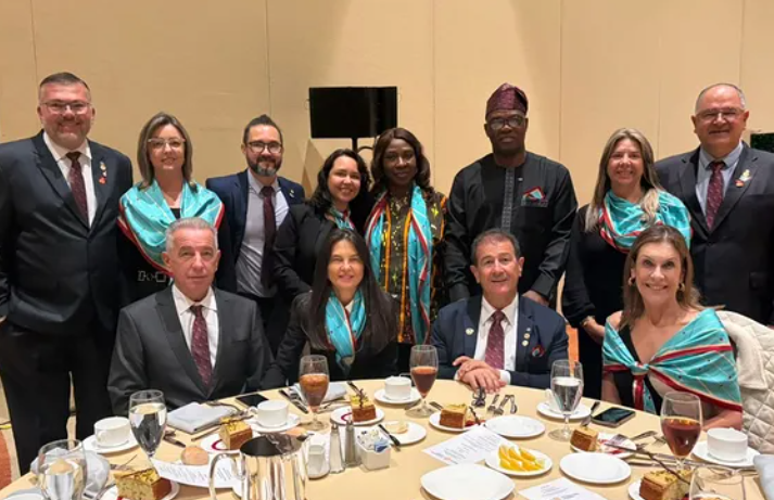 🔹 Governador Eleito do Ano Rotário 2026-27 Nelson Azevedo e sua cônjuge Fabiane, em almoço com o Presidente Eleito de Rotary Internacional 2026-27 Olayinka Hakeem Babalola.