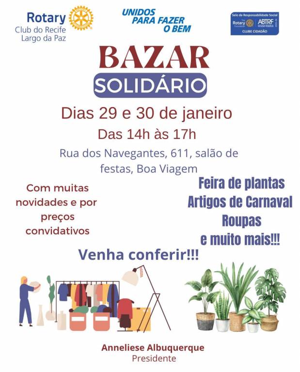 O Bazar Solidário do Rotary Club Recife Largo da Paz, com o fito de arrecadação de fundos para que seja possível efetuar ações e projetos sociais pelo Clube, nos dias 29 e 30 de janeiro do corrente, período da tarde, foi excelente oportunidade para todos!!! A venda de vários itens, tais como: roupas diversas femininas e masculinas, fantasias de carnaval, itens de decoração do lar e roupas de cama. O grande destaque do nosso Bazar foram as plantas diversas da Sementeira Lima, cultivadas com muito carinho pelo Companheiro Geraldo Lima. Vários convidados circularam pelo ambiente. Foi promovido delicioso lanche e a música estava sempre presente animando o ambiente.
