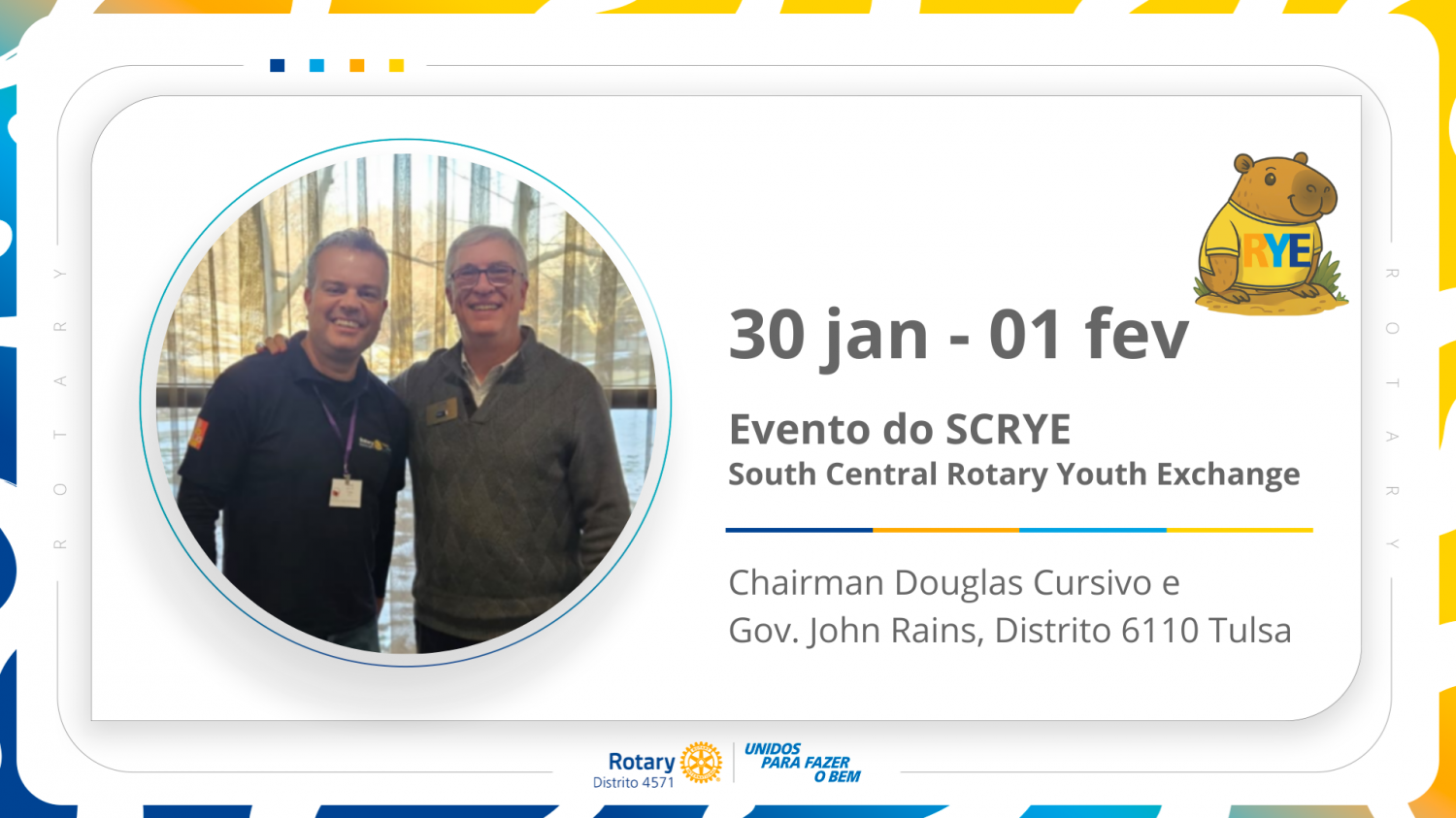 Douglas Cursino, Chairman do programa de intercâmbio de jovens do Distrito 4571, participou recentemente de um evento significativo em Oklahoma. Ele representou o nosso distrito no SCRYE - South Central Rotary Youth Exchange, com o objetivo de buscar novas vagas de intercâmbio para os jovens.
