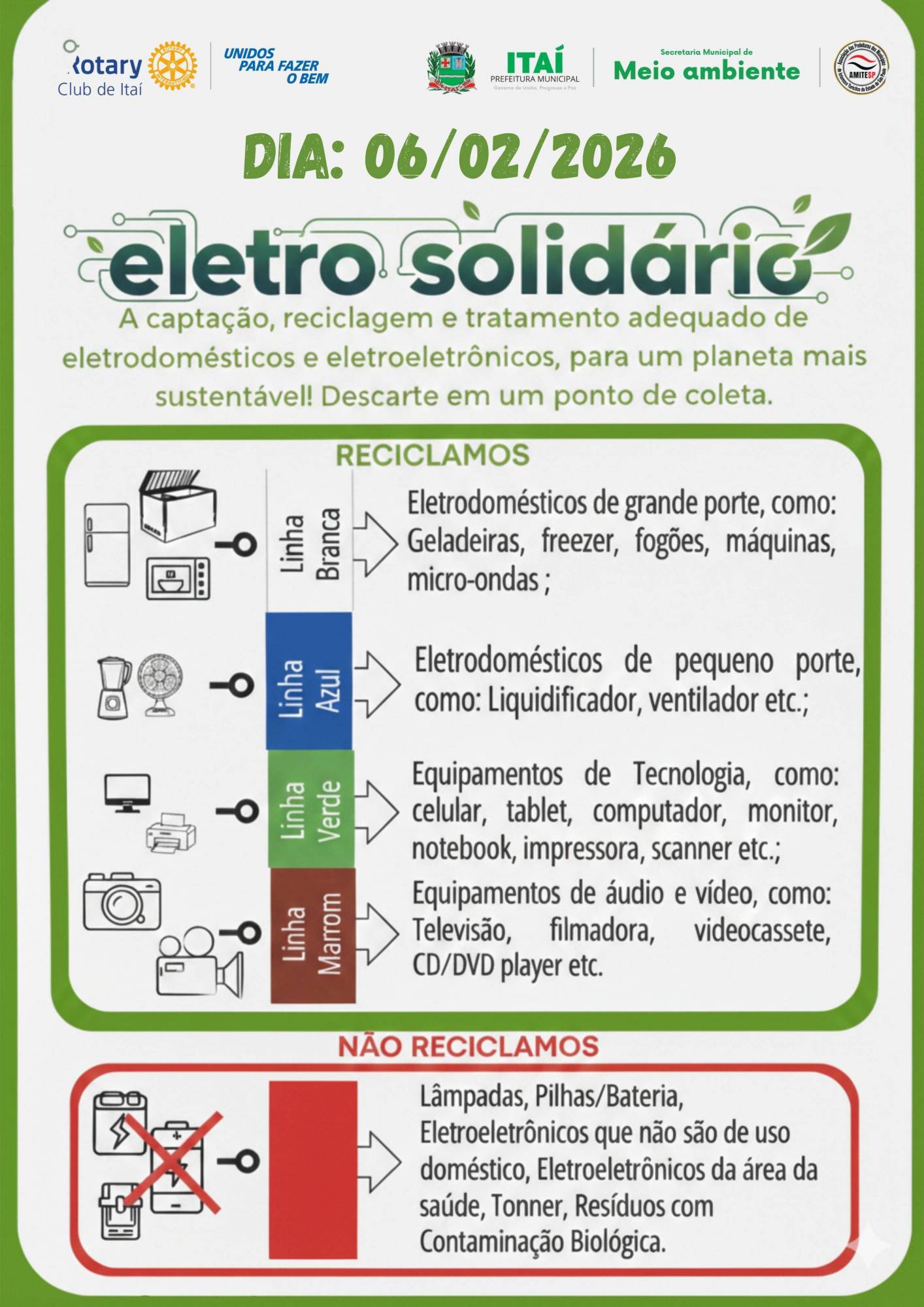 No dia 06/02/2026, a campanha estará realizando a recolha de eletrodomésticos e lixo eletrônico .