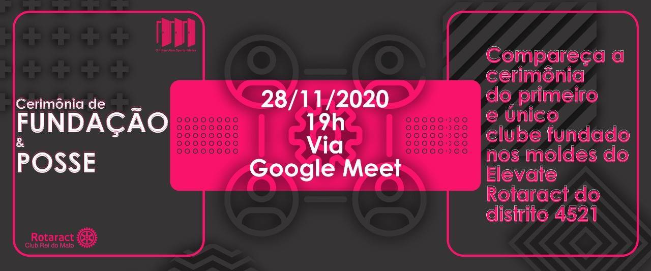 O Rotaract Club Rei do Mato tem a honra de convidar para a solenidade de fundação do clube e posse da mesa diretiva eleita e demais associados e cargos da gestão 2020/21.