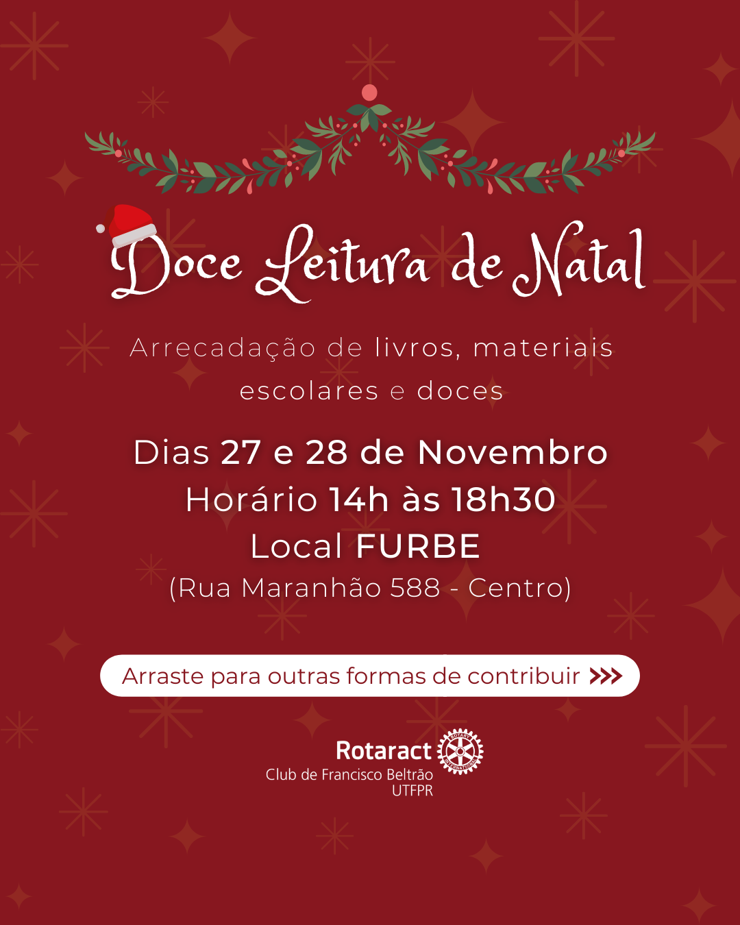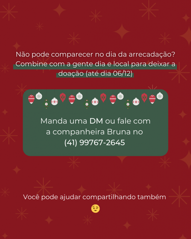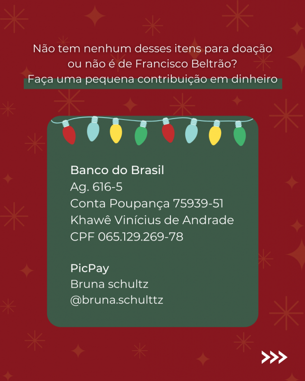 O Rotaract Club Francisco Beltrão UTFPR estará arrecadando livros, materiais escolares e doces para a confecção de cestas natalinas destinadas ao projeto "Criança Feliz" atendido pelo CRAS da cidade. As doações poderão ser feitas na FURBE (rua Maranhão 828, centro) das 14h às 18h30 nos dias 27 e 28 de novembro. As doações também poderão ser feitas para a companheira Bruna com horário e dia a combinar pelo (41) 9 9767-2645 ou em nossas redes sociais @rotaract.utfprfb. Uma conta foi disponibilizada para os companheiros que quiserem ajudar monetariamente. As doações serão aceitas até o dia 06 de dezembro.