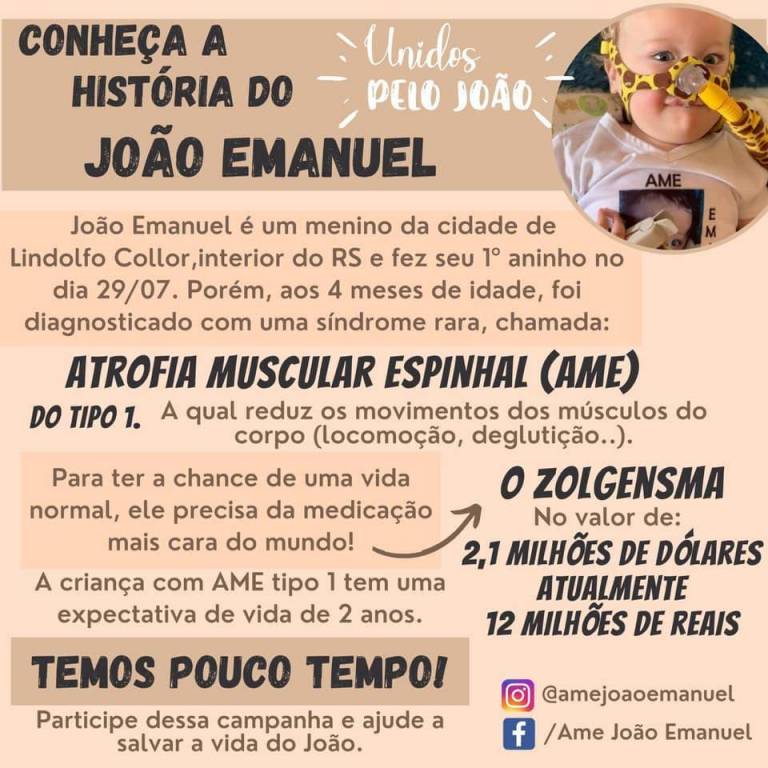 O menino João Emanuel, da cidade de Lindolfo Collor, possui a doença AME Tipo 1 (Atrofia Muscular Espinhal) e depende do remédio mais caro do mundo, o Zolgensma, que possui um custo de aproximadamente 12 milhões. Este medicamento pode ser aplicado somente até os dois anos de idade.