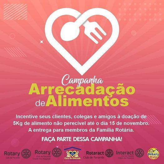 Na última semana do mês de novembro, a Família Rotária Panambiense composta por Rotary Club de Panambi, Rotary Club Cidade das Máquinas, Rotaract Club de Panambi, Interact Club Cidade das Máquinas, Rotary Kids e Casa da Amizade de Panambi, realizou a entrega de cerca de 1.600kg de alimentos e também material de limpeza, arrecadados durante a Campanha de Arrecadação interna e também na sociedade. As entidades beneficiadas foram: Cruz Azul, AVOCAP, Lar Tabea, Lar Vó Dari e Centro de Assistência ao Idoso os quais receberam juntas 60% dos donativos e ao CRAS ao qual se destinou 40% do total arrecadado, para a distribuição entre as famílias que se entram em vulnerabilidade social e enfrentando necessidades em nosso município.