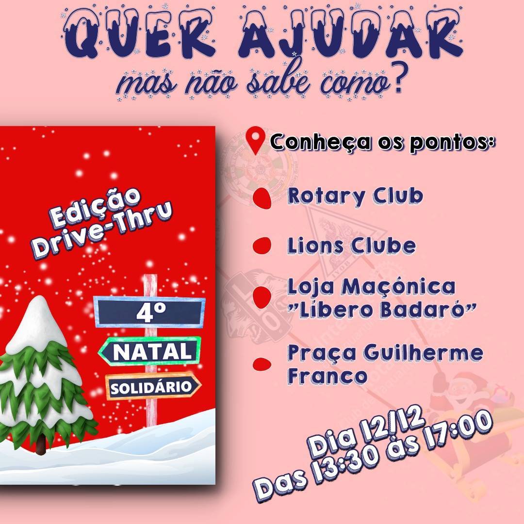 No dia 12 de dezembro o Rotaract Club de Taquaritinga juntamente com os clubes Interact, Demolay, Semente Maçônica, Filhas de Jó e LEO realizaram a 4° edição do Natal Solidário arrecadando alimentos, produtos de limpeza e higiene para instituições da cidade e famílias carentes.