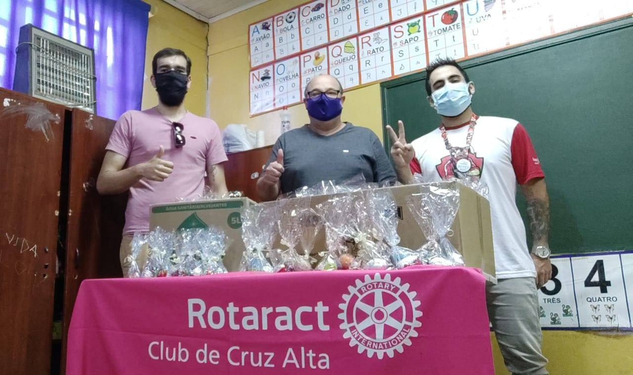 Na última segunda feira (29/03/2021), representantes do Rotaract Club de Cruz Alta estiveram na EMEF Intendente Vascancelos Pinto fazendo a entrega de 217 cestinhas de páscoa, compostas por bonbons, ovinhos de chocolate, carapinhas, balas e pirulitos que serão entregues as crianças do 1º ao 9º ano da escola. O projeto surgiu como um incentivo as crianças a olharem para um horizonte mais colorido e cheio de possibilidades, uma lembrança de que não estão sozinhas, visto que a pandemia COVID-19 tem dificultado muito as vidas de todos, tanto num lado econômico quanto psicológico. O projeto foi desenvolvido com a ajuda dos membros do clube e patrocínio de amigos e comerciantes locais.