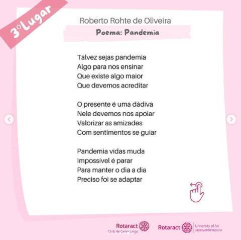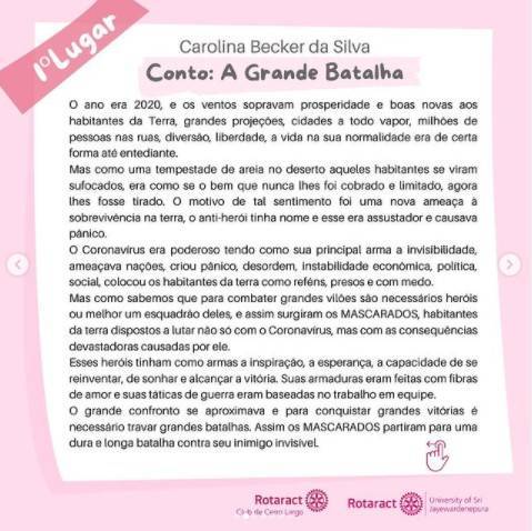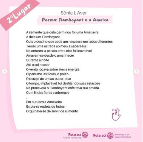 Em 1° lugar o conto: “A Grande Batalha” de @curu.becker ; em 2° lugar o poema: “Flamboyant e a Ameixa” de @sonialorenaaver ; e em 3° lugar o poema “Pandemia” de @robertorohte . Classificação já anunciada aqui. 🏆