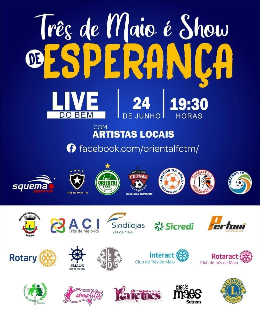 Será dia 24/06 às 19h30min, com transmissão pelo Facebook do Oriental Três de Maio.