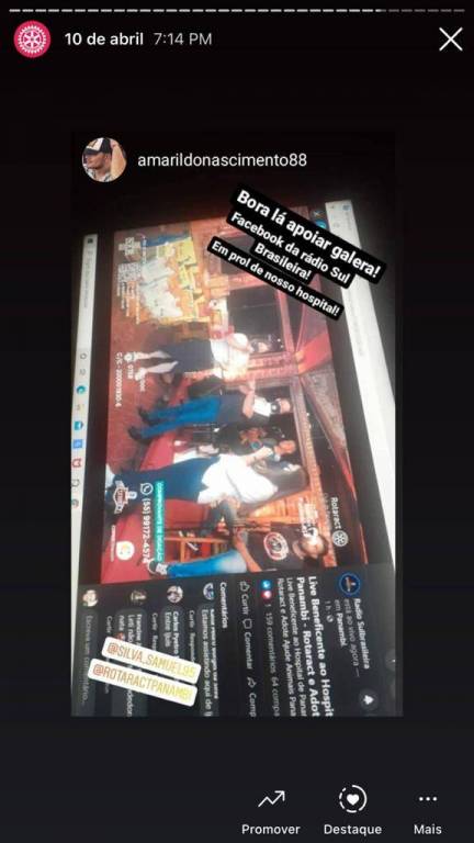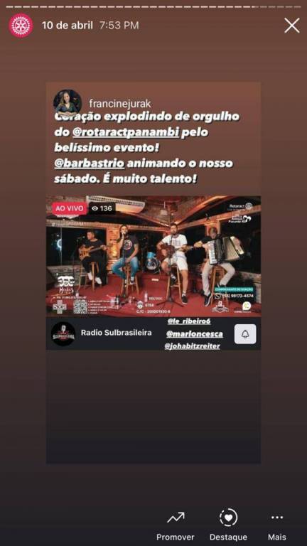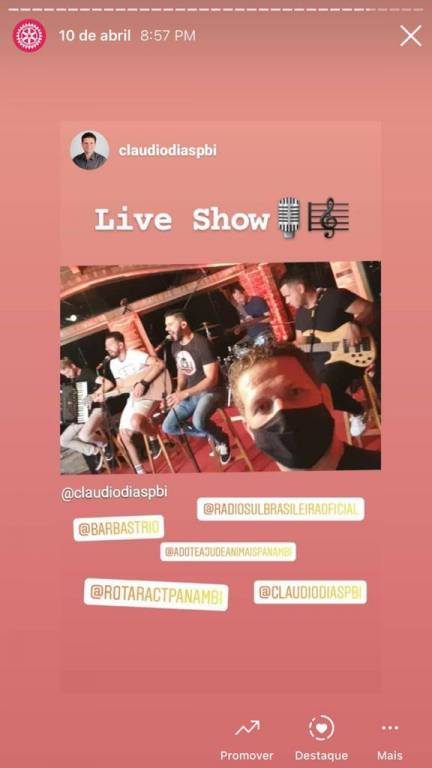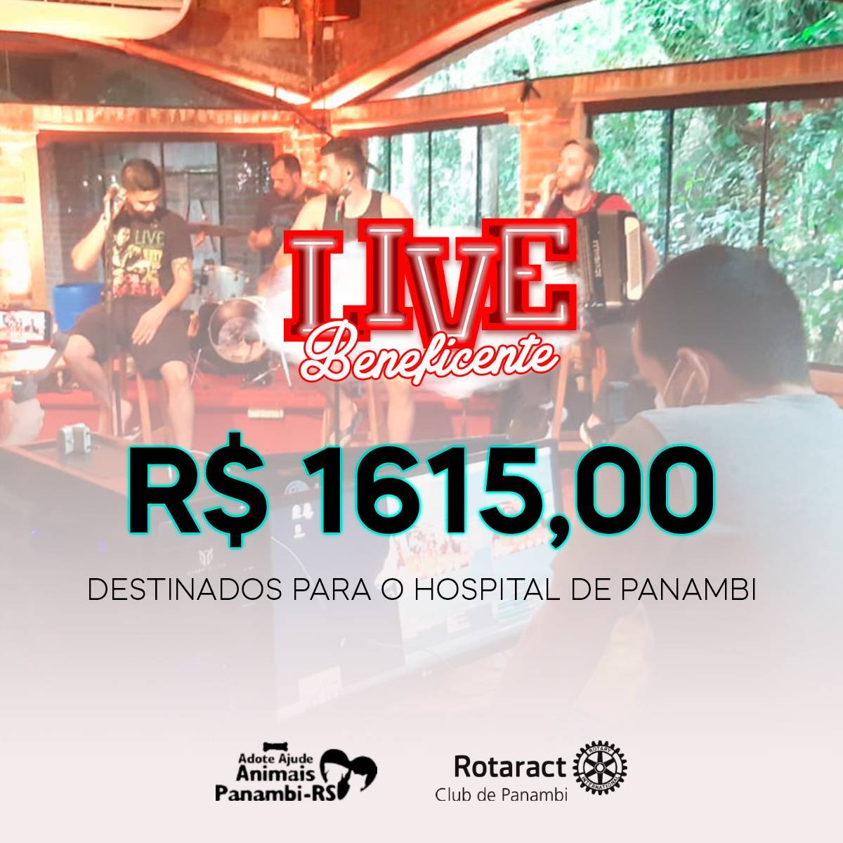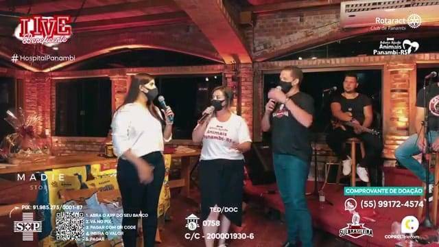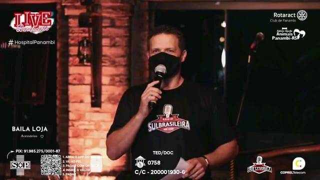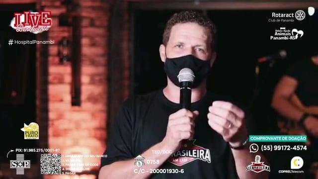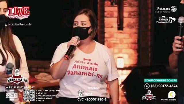 Nesse novo cenário de pandemia, eventos on-line estão cada vez mais populares, possibilitando a comunicação e transmissão para qualquer lugar atingindo o maior número de pessoas. De acordo com a Revista Forbes, 2020 será um ano lembrado pela Covid-19, e também, pela popularização das livestreams (ou lives), uma forma de vídeo onde o produtor grava e transmite o conteúdo em tempo real, por meio de uma plataforma na internet. Partindo dessa premissa, o Rotaract Club de Panambi juntamente com a Adote/Ajude Animais Panambi desenvolveu a ideia de oferecer a comunidade uma live arrecadando valores em prol da Sociedade Hospital Panambi, que no mês de Março de 2021, publicou uma nota em suas redes sociais comunicando as dificuldades financeiras devido ao aumento de casos do COVID-19 e o lockdown na cidade. A Sociedade Hospital Panambi foi fundado em 15 de Dezembro de 1956 entrando em funcionamento em Janeiro de 1968. Com seus 53 anos, a SHP conta hoje com um amplo número de funcionários, enfermeiros e médicos, abrangendo as cidades de Panambi, Condor e Santa Bárbara do Sul. Desde o início, a ideia foi buscar parcerias com comerciantes de Panambi, atrações de música e local para transmissão da live, com isenção de custos, assim, não gerando despesas, de modo a reverter todo o valor ao Hospital. Com três semanas para organizar a live, em menos de uma semana o mesmo já estava com o local, data, horário, atrações e parcerias confirmadas, custeados e ofertados de forma gratuita. Na segunda semana, trabalhou-se em cima dos ofícios que seriam enviados a Prefeitura da cidade, a fim de apresentar o projeto e pedir autorização para a realização da mesma, visto que no momento a cidade se encontrava em bandeira preta (significando alto risco de contágio pelo vírus). Houve ressalvas por parte da Prefeitura referente ao horário e quantidade de pessoas envolvidas. O clube e a Adote/Ajude se adequaram as solicitações, ficando acordado com a Prefeitura que o evento se iniciaria as 18h sendo encerrada as 20h, com limitação máxima de cinco pessoas na organização interna. Desta forma, foi combinado que seriam feitos turnos de trabalho com quatro pessoas por hora, iniciando as 13h desde a organização e decoração do ambiente. Além de beneficiar a SHP com valores doados, um dos objetivos era também divulgar o grupo Adote/Ajude, criado em 2017 e conta hoje com três protetoras. O principal objetivo do grupo é resgatar animais em situação de rua e maus tratos, fornecendo tratamentos veterinários e consequentemente, uma adoção responsável. Como apoiador principal, a Rações Puro Trato fez uma doação no valor de R$ 1.000,00 (equivalente a 186kg) em ração ao grupo Adote/Ajude. Na semana da live, foi definido os meios de doação que seriam fornecidos durante a live, ficando disponível o PIX do SHP, TED/DOC, depósitos e também valores para o leilão. No dia da live, já com a Internet instalada, decoração, mesa de transmissão, passagem de som e instrumentação, estava tudo pronto para o início. No decorrer da live, iniciaram as doações e os lances para o leilão, onde quem dava o maior lance, adquiria um prêmio doado de maior valor. O valor total arrecadado foi de R$ 1.615,00, repassado de forma oficial ao presidente do SHP na semana subsequente a live.
