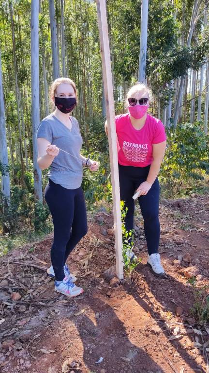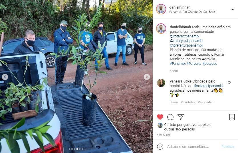 O início do projeto se deu quando o Presidente do clube apresentou a ideia de criar um pomar municipal na cidade de Panambi, na reunião semanal do dia 05/12/2020, a qual foi aceita e apoiada pelos demais companheiros. Dessa forma, aqueles que se dispuseram a auxiliar no projeto criaram um grupo no WhatsApp para organizar as atividades, criar o esboço do projeto e designar as tarefas para a sua realização. No início foram realizados contatos com os responsáveis de diversas entidades (IFFar, Prefeitura, Sesi) a fim de encontrar um local disponível e adequado para o plantio de árvores frutíferas no Município de Panambi, entretanto, com pouco êxito e adesão destas entidades. Felizmente, no dia 11/02/2021, teve-se retorno do Paulo Schwingel, Secretário de Obras do Município de Panambi, o qual demonstrou interesse em dar auxílio e assistência ao projeto Pomar Municipal. Dessa forma, ficou estabelecido que a Prefeitura disponibilizaria dois terrenos para o plantio, um deles localizado na Agrovila (Rua Luiz Felipe Schmidt, lado par, esquina com a Travessa Lourenço Schmidt, no Bairro Zona Norte - Panambi) e outro no Museu a Céu Aberto (Rua Iriapira, Bairro Kuhn - Panambi), resultando então na criação e implementação de dois pomares municipais. Logo no dia 19/02/2021, os associados Caroline Schemmer e Samuel da Silva, juntamente com Paulo Schwingel, realizaram uma visita ao local de plantio na Agrovila, ocasião que este explicou mais profundamente como deveria ocorrer o plantio, quais as necessidades do dois local, como exemplo, a exigência de 50% de cítricas e espaçamento de 4-5 metros entre as árvores. Para mais, ficou estabelecido que a Prefeitura doaria as mudas para o plantio no Museu a Céu Aberto, bem como as estacas para ambos os locais, além da prévia limpeza dos terrenos e adubação orgânica. O que restou como encargo para o Rotaract as mudas frutíferas da Agrovila e as placas de identificação dos pomares. Para tanto, a associada do clube Vanessa Ludke desenvolveu um croqui de locação para fins quantitativos do plantio, com o intuito de estabelecer e projetar espaçamentos mínimos entre plantas, calçadas e lotes vizinhos do pomar da Agrovila. Para uma melhor visualização, fez-se uma modelagem 3D da área de análise como complemento da representação. Posteriormente, fez-se o orçamento das mudas com uma floricultura local parceira do clube, Rancho das Flores, a qual repassou informações referentes a valores, tipos de muda e práticas de plantio. Também realizou-se uma pesquisa de custo e orçamento das placas de identificação dos pomares. As mesmas serão locadas nos terrenos com caráter de locação e informação a população sobre o Pomar Municipal. Elaborou-se então um material para apresentar à família rotária, com o intuito de adquirir o apoio dos mesmos e demonstrar a relevância do projeto para a comunidade panambiense em um âmbito geral. E, portanto, no dia 08/03/2021, o companheiro Roger Brackmann fez a apresentação do material na Reunião do Rotary Club de Panambi. Na reunião fez-se presente outros companheiros do Rotaract e demais companheiros do Rotary. Assim, pode-se explanar o trabalho realizado pelo Rotaract Club de Panambi e compartilhar ideias com os rotarianos, os quais se mostraram interessados em auxiliar na execução e na contribuição com ideias que auxiliaram no desdobramento do projeto. Desse modo, findou-se a reunião com o apoio do Rotary Club de Panambi no projeto exposto pelo Rotaract, contando com o auxílio financeiro do Rotary Padrinho. Após isso, o projeto começou a ser posto em prática. Inicialmente, a Prefeitura de Panambi ficou responsável pela limpeza do terreno na Agrovila, uma vez que havia lixo, ervas daninhas, grama alta e algumas árvores de cajueiro-japonês no local. Assim, com a limpeza já realizada, encomendou-se 95 mudas frutíferas na floricultura local, Rancho das Flores, sendo 50% cítricas (laranja umbigo cedo, laranja umbigo tarde, laranja para suco, laranja natal, laranja do céu, bergamota ponkan, bergamota comum, entre outras) e 50% brancas (caqui chocolate preto, caqui chocolate branco, ameixa vermelha, ameixa amarela, pêssego cedo, nectarina, pêra macia, entre outras). Alguns dias depois, em um domingo, alguns companheiros do Rotaract Club foram até o local da Agrovila para medir o distanciamento entre as mudas e marcar com cal onde deveria ser realizada a perfuração para posterior plantio. Foram respeitados os espaçamentos mínimos entre plantas (4 metros), calçadas e lotes vizinhos (2 metros), conforme o croqui que havia sido feito, entretanto, após contagem das marcações, percebeu-se que deveriam ser alocadas mais mudas do que o planejado. Dessa forma, além das 95 mudas já encomendadas, foi realizado o pedido de mais 30 mudas das mesmas espécies das já mencionadas, completando o total de 125 mudas. Com o intuito de alinhar os últimos detalhes acerca do projeto do Pomar Municipal, os integrantes do Rotaract, responsáveis pelo mesmo, realizaram uma reunião virtual pelo Meet, na quarta à noite, que contou com a presença de 4 companheiros. Nesta reunião foram discutidas algumas pendências do projeto, como exemplo, o design e a encomenda das placas de identificação dos pomares, a perfuração dos buracos que ainda deveriam ser realizados pela Prefeitura Municipal de Panambi e que materiais faltavam para o dia do plantio (enxadas, água, barbantes e baldes). Na manhã de segunda-feira que se sucedeu, o companheiro Samuel da Silva foi ao encontro do Paulo Schwingel, responsável da Prefeitura Municipal de Panambi frente ao projeto do Pomar Municipal, falar a respeito dos detalhes que haviam sido discutidos na reunião do Meet. Com tudo acertado para o dia do plantio, restou que as perfurações aconteceriam na mesma segunda-feira, terça-feira e quarta-feira posteriores. Por conseguinte, os buracos foram realizados pela Prefeitura nos dias já menc