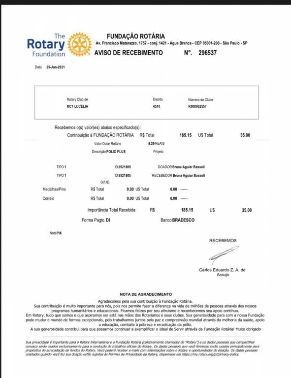 O Rotaract Club de Lucélia, na data de hoje, 25 de junho de 2021, realizou a doação de 35 dólares para a Fundação Rotária.