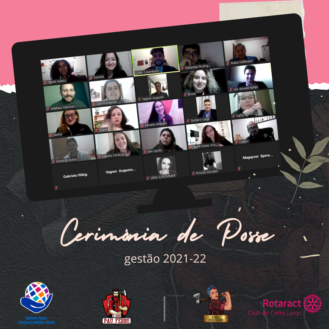 #pracegover  No centro da imagem está uma televisão, na qual está a foto dos participantes da reunião que ocorre de maneira online via plataforma zoom. Abaixo da foto está escrito "Cerimônia de Posse, gestão 2021-22", na parte inferior da foto está a logo do lema rotário "servir para transformar vidas", a lenhadora e o lenhador do distrito 4660 e a logo do Rotaract Club de Cerro Largo.