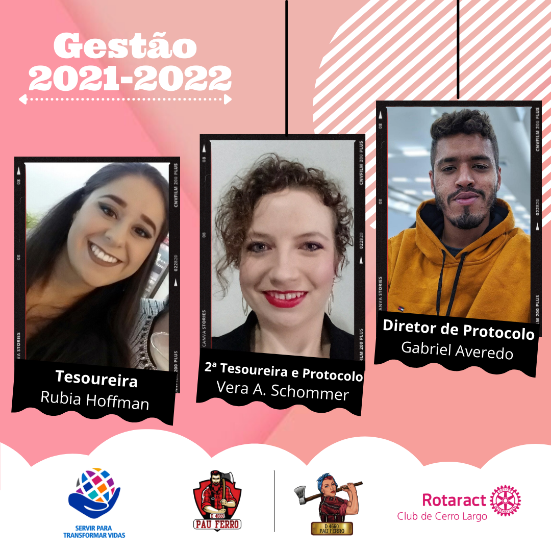 Apresentamos as tesoureiras do clube, as gurias da verba, "seu barriga" do Rotaract, financiadoras de projetos, seguranças do tesouro do clube, que todo mês aparecem para dar o ar da graça. Aquelas que dizem "ih, presi, isso aí tá caro demais". A galera do Protocolo organiza nossa reunião quinzenal. Eles tornam nossos encontros mais dinâmicos e objetivos, para que não percamos o foco chorando as pitangas da pandemia.