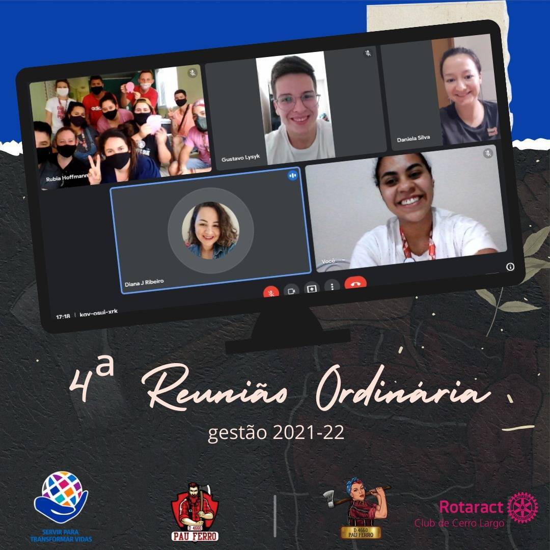 #PraCegoVer A parte superior da imagem apresenta um fundo azul, no centro da imagem está uma televisão, na qual está a foto dos participantes da reunião. Abaixo da foto está escrito "4ª Reunião Ordinária, gestão 2021-22", na parte inferior da foto está a logo do lema rotário "servir para transformar vidas", a lenhadora e o lenhador do distrito 4660 e a logo do Rotaract Club de Cerro Largo.