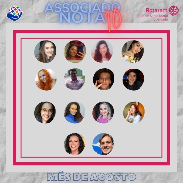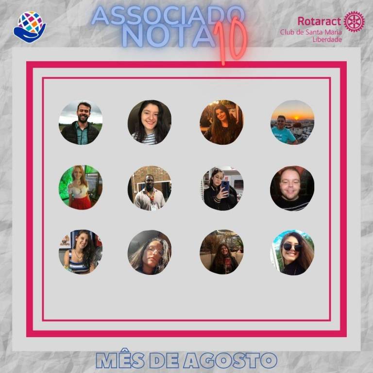 #ParaTodosETodasVerem a arte possui um fundo cinza com uma moldura em rosa cranberry. No canto superior direito há a logo da gestão e no superior esquerdo a logo do Rotaract Santa Maria Liberdade na cor cranberry. No título em cores azul e rosa neon há os escritos “Associado nota 10”, e no rodapé em azul com letras vazadas “mês de agosto”. Ao longo da imagem, há fotos dos 21 associados que obtiveram bom desempenho durante o último mês.