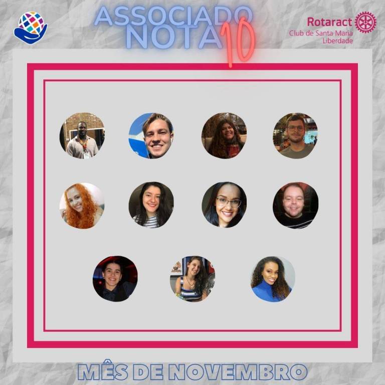 #ParaTodosETodasVerem a arte possui um fundo cinza com uma moldura em rosa cranberry. No canto superior direito há a logo da gestão e no superior esquerdo a logo do Rotaract Santa Maria Liberdade na cor cranberry. No título em cores azul e rosa neon há os escritos “Associado nota 10”, e no rodapé em azul com letras vazadas “mês de novembro”. Ao longo da imagem, há fotos dos 23 associados que obtiveram bom desempenho durante o último mês.