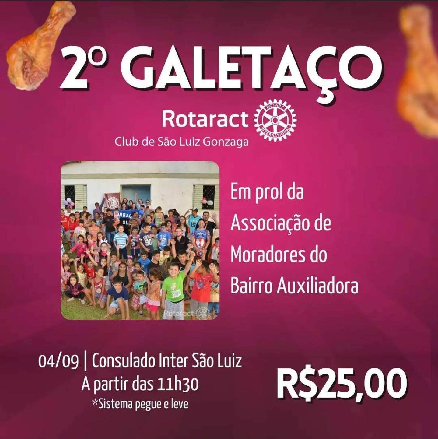O Rotaract Club de São Luiz Gonzaga está promovendo galetaço em prol da sede de moradores do bairro Auxiliadora. O evento acontecerá no dia 4 de setembro de 2021 e dará continuidade ao projeto REFAZ, o qual está revitalizando a Sede de Moradores do Bairro Auxiliadora.