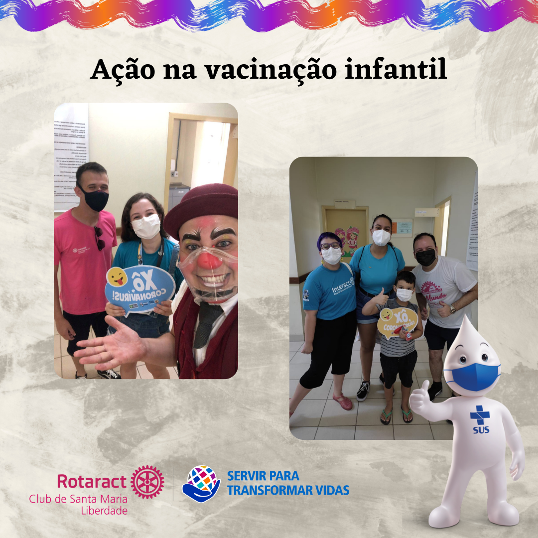 A campanha de vacinação infantil contra a Covid-19, no município de Santa Maria, teve início com as crianças com comorbidades e/ou deficiência permanente. Sabendo da diversidade e complexidade deste público, a Prefeitura Municipal através da Secretaria de Saúde convidou os clubes de Serviço (Rotary, Rotaract, Interact e Leo Club) para que auxiliassem no processo de acolhimento das crianças durante o processo de vacinação. Durante as duas semanas, a ação atendeu 400 crianças, em duas Unidades Básicas de Saúde, onde foram entregues mensagens de apoio à vacina contendo um balão, revistas infantis de educação ambiental, pirulitos e espaço de desenho e pintura.
