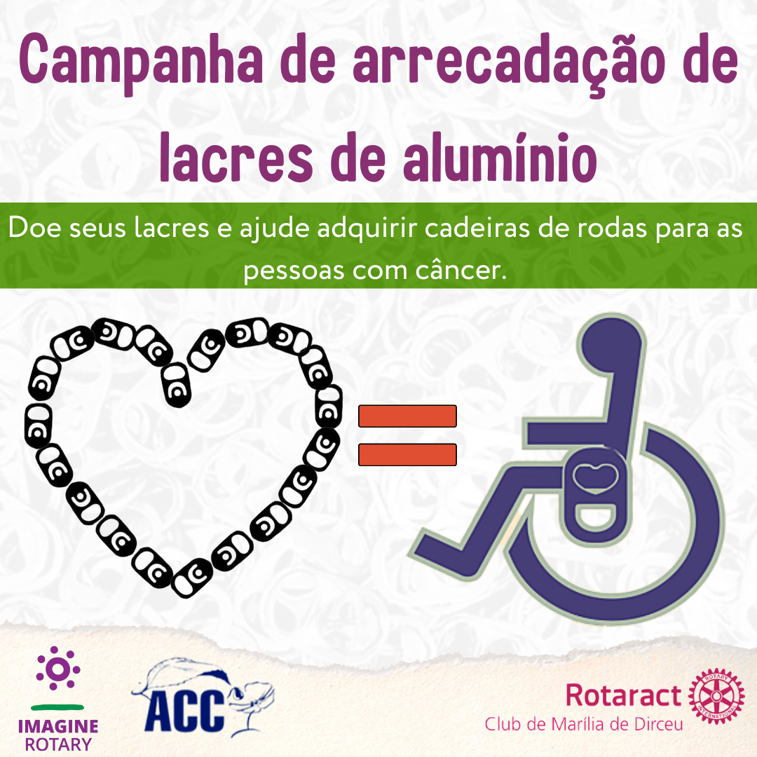 Nós do Rotaract Club Marília de Dirceu, aderimos a iniciativa de arrecadar lacres de alumínio para doar para Associação de Combate ao Câncer de Marília e região (ACC) visto que eles estão com dificuldade para arrecadar para trocar por cadeiras de rodas que ajudam no tratamento dos seus pacientes.