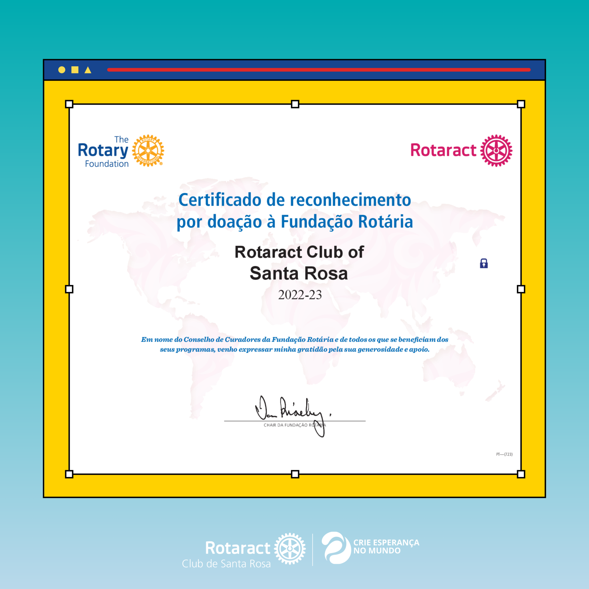O Rotaract Club de Santa Rosa é um dos mais de 640 clubes que receberam o certificado de doação no último ano rotário. Juntos, esses clubes arrecadaram mais de US$ 240.000 para a Fundação, possibilitando que a entidade continue oferecendo subsídios para projetos humanitários do Rotaract e do Rotary que causam impacto ao redor do mundo.