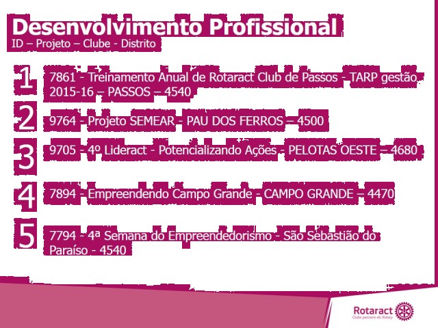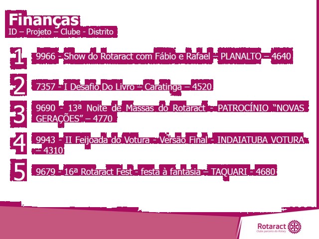 O Rotaract de Planalto tinha apenas 1 de seus projetos inscritos e concorrendo a uma das 5 vagas em duas categorias, em Finanças e Imagem Publica.