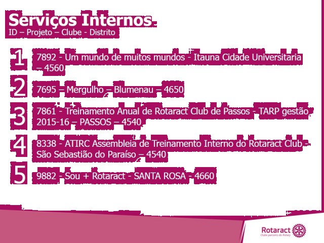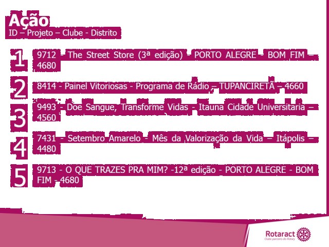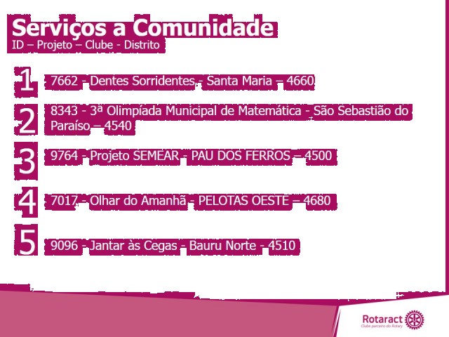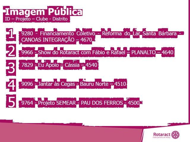 Queremos parabenizar os mais de 2500 projetos que estavam concorrendo. Isso demonstra a imensidão da nossa Organização, a Rotaract Brasil.