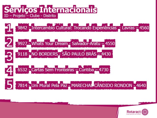 Aos Clubes do Distrito 4640 que estarão juntos em Janeiro de 2017, na cidade de São José do Rio Preto - São Paulo, o Rotaract de Marechal, de Quedas do Iguaçu e o Foz Do Iguaçu M'Boicy, boa sorte e parabéns.