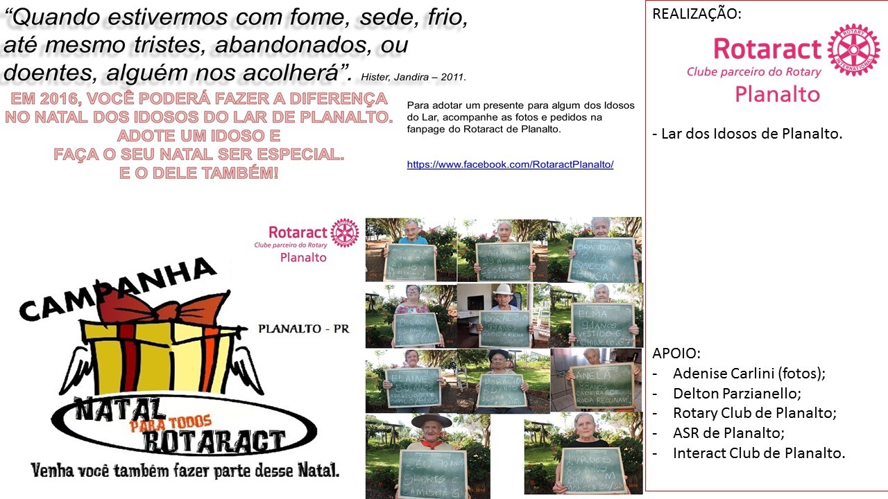 Este projeto visa a arrecadação de donativos em prol do Lar de Idosos de Planalto. Neste ano, a partir de uma necessidade expressa do Lar, o clube está promovendo adoções de pedidos de Natal dos Idosos. A partir de fotos com os pedidos escritos em um quadrinho, as fotos estão sendo divulgadas na fanpage do clube (https://www.facebook.com/RotaractPlanalto/), e quem desejar adotar um pedido, deve comentar na foto que irá adotar o pedido.