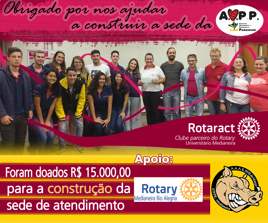 Na ultima reunião, nesta terça(30/05), tivemos o prazer e a oportunidade de arrecadar e entregar a doação de um valor de R$ 15.000,00 para a Associação Medianeirense de Portadores de Parkinson. Este dinheiro será usado na construção da estrutura dessa associação que atende a mais de 70 famílias que são devastadas pelos efeitos dessa doença que não tem cura.