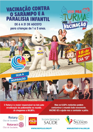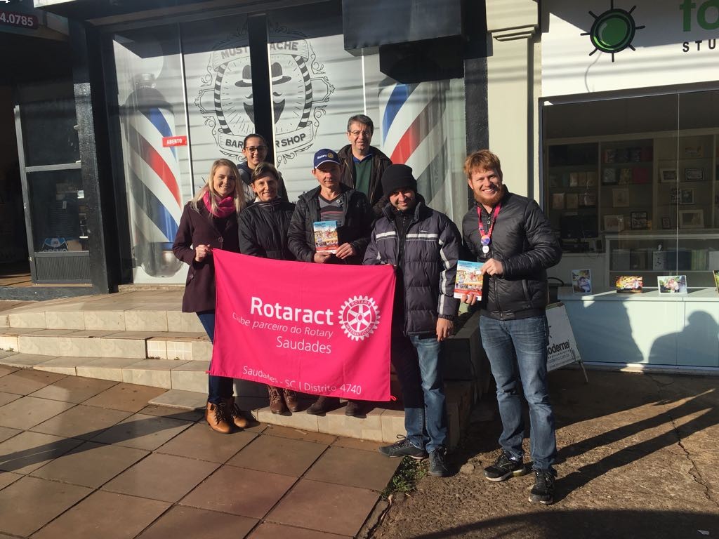 Pedagio da Poliomielite onde o Rotaract Juntamente com o Rotary fizeram no Dia 11/07 o insentivo e lembrete da vacinação da poliomielite, ficaram no centro da rua em Saudades com o auxilio da Policia Militar  entregando folder para os motoris que passavam,lembrando a importancia da vacinação