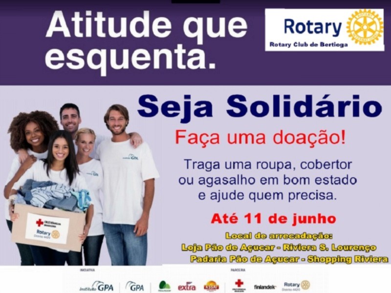 O Rotary Club de Bertioga em parceria com o Grupo Pão de Açucar estará arrecando agasalhos, cobertores e roupas em bom estado para doar para as instituições carentes de nossa cidade. Esta campanha se estenderá até o dia 11 de junho e os locais de arrecadação serão a loja do Pao de Açucar da Riviera de São Lourenço e a Padaria do Pão de Açucar do Shopping da Riviera.