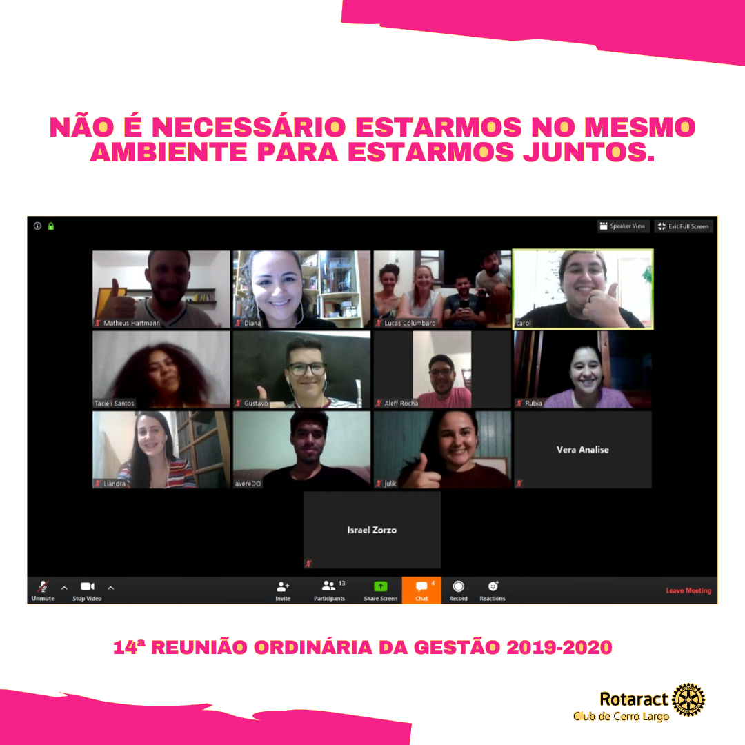 No dia 26 de abril de 2020, às 18h, os companheiros do Rotaract Club de Cerro Largo reuniram-se por meio vídeo-chamada para a 14ª Reunião Ordinária da gestão 2019-2020 do clube.