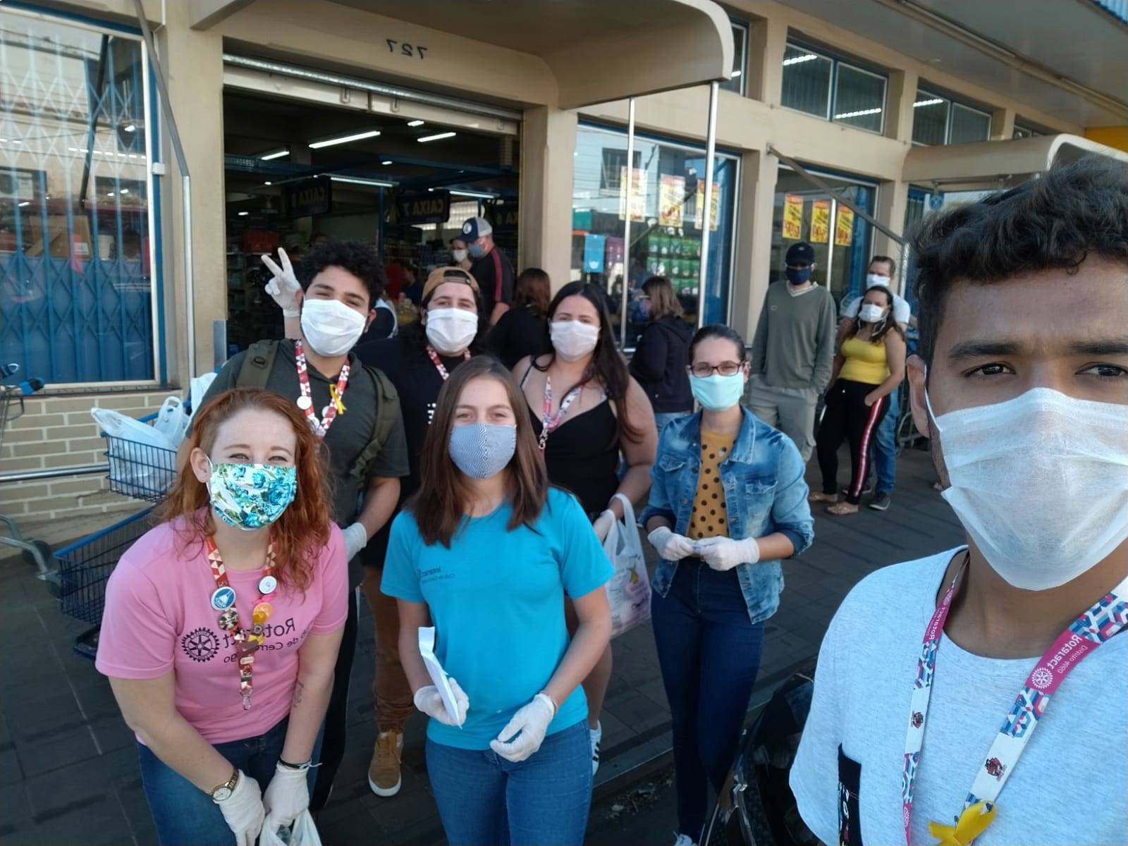 Na tarde de 02 de maio, seis rotaractianos, uma interactiana e uma convidada estiveram nas portas dos principais mercados de Cerro Largo sensibilizando as pessoas que faziam suas compras a cuidarem de sua saúde (adotando medidas de prevenção ao coronavírus) e a doarem alimentos às pessoas que não tem condições de comprar.