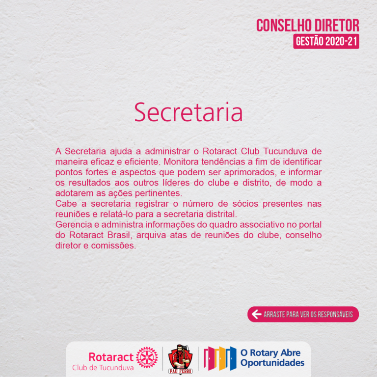 A Secretaria ajuda a administrar o Rotaract Club Tucunduva de maneira eficaz e eficiente. Monitora tendências a fim de identificar pontos fortes e aspectos que podem ser aprimorados, e informar os resultados aos outros líderes do clube e distrito, de modo a adotarem as ações pertinentes.