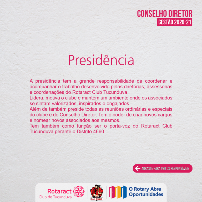 A presidência tem a grande responsabilidade de coordenar e acompanhar o trabalho desenvolvido pelas diretorias, assessorias e coordenações do Rotaract Club Tucunduva.