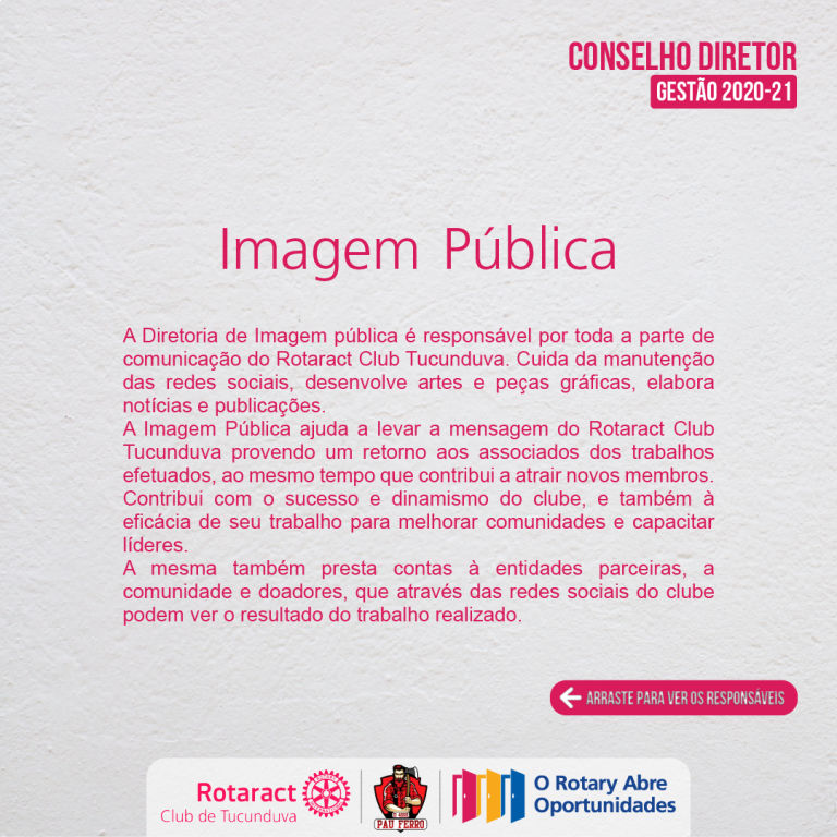 A Diretoria de Imagem pública é responsável por toda a parte de comunicação do Rotaract Club Tucunduva. Cuida da manutenção das redes sociais, desenvolve artes e peças gráficas, elabora notícias e publicações.