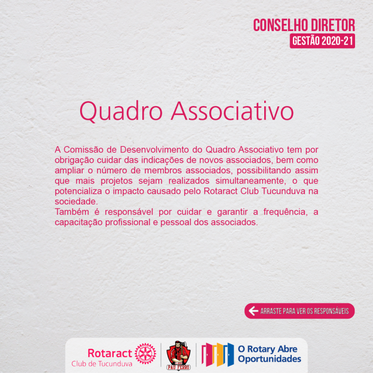 A Comissão de Desenvolvimento do Quadro Associativo tem por obrigação cuidar das indicações de novos associados, bem como ampliar o número de membros associados, possibilitando assim que mais projetos sejam realizados simultaneamente, o que potencializa o impacto causado pelo Rotaract Club Tucunduva na sociedade.