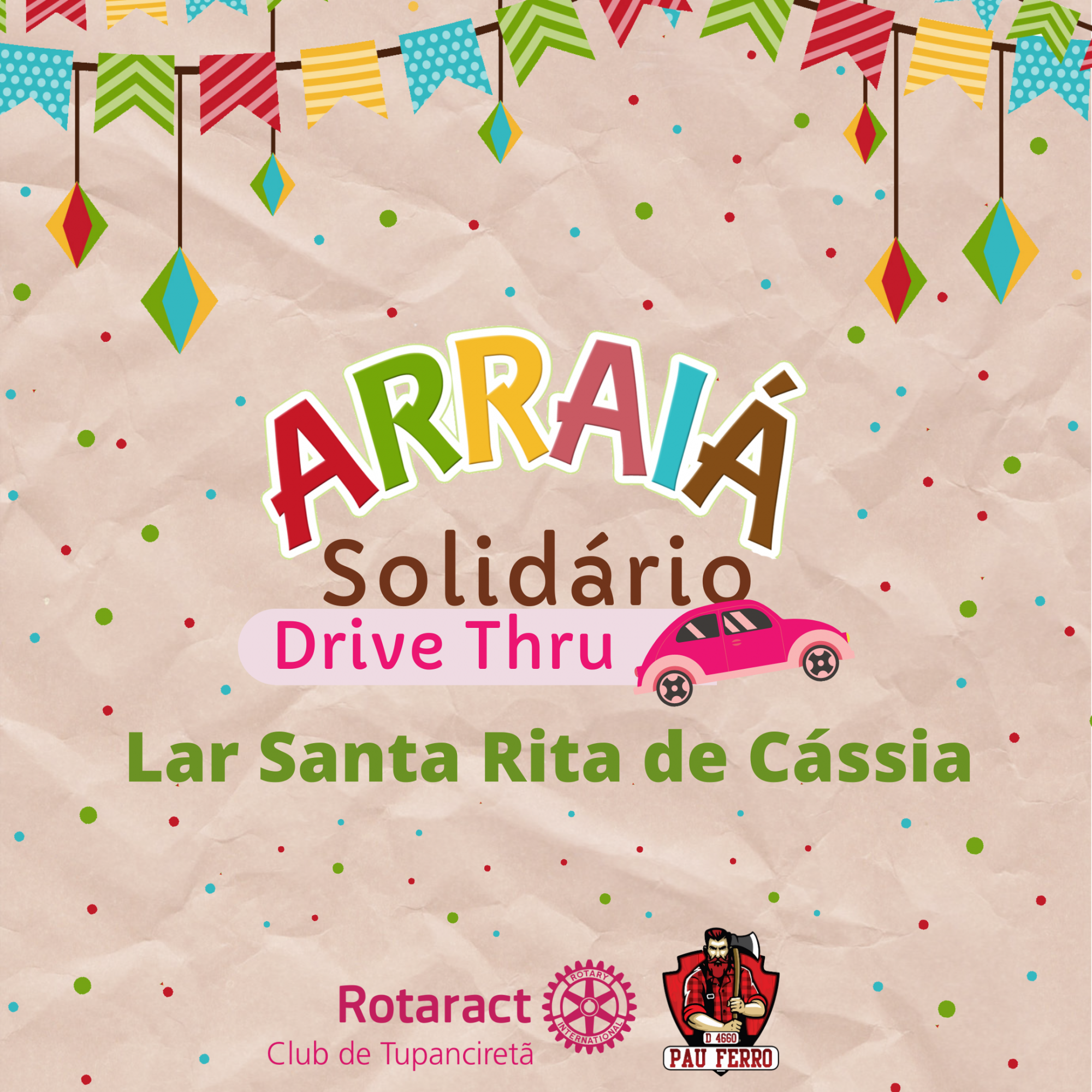 No dia 01/08/2020, realizou-se o projeto "Arraiá Solidário Drive Thru" que teve o intuito de arrecadar materiais de limpeza e de higiene para o Lar Santa Rita de Cássia. Cumprindo com o distanciamento social e tomando todos os cuidados possíveis, a cada pessoa que doava produtos de limpeza e higiene, era entregue um saquinho de pipoca e um copo de quentão. O Rotaract Club de Tupanciretã, agradece a todos que de alguma forma participaram do nosso projeto.