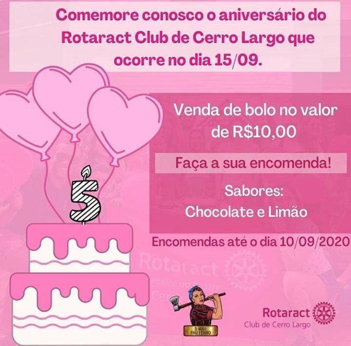 No dia 15 de setembro de 2020 o Rotaract Club de Cerro Largo completa cinco (5) anos de história,e, nada mais justo e simbólico do que comemorar com bolo!