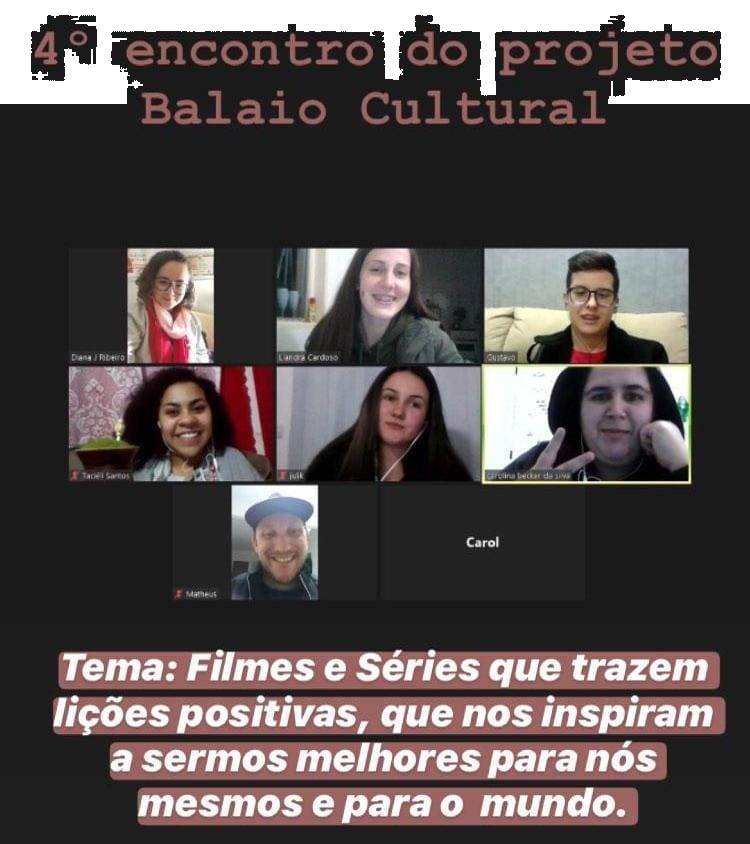 O projeto Balaio Cultural, em sua 4 º edição, realizado nesta quinta-feira 13 de agosto de 2020, teve a  temática voltada para " Filmes e séries que tragam lições positivas de vida, de como ser um ser humano melhor para si mesmo e paro mundo".