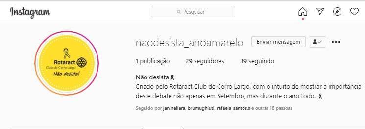 Criamos um Instagram "@naodesista_anoamarelo" que vem afim de transmitir as pessoas, a importância que a vida tem durante todo o ano rotário, e trazendo informações de pessoas especializadas, bem como, desmestificar algun tabus.