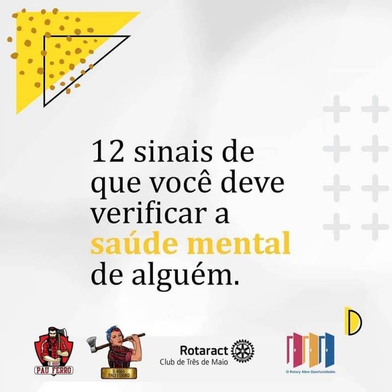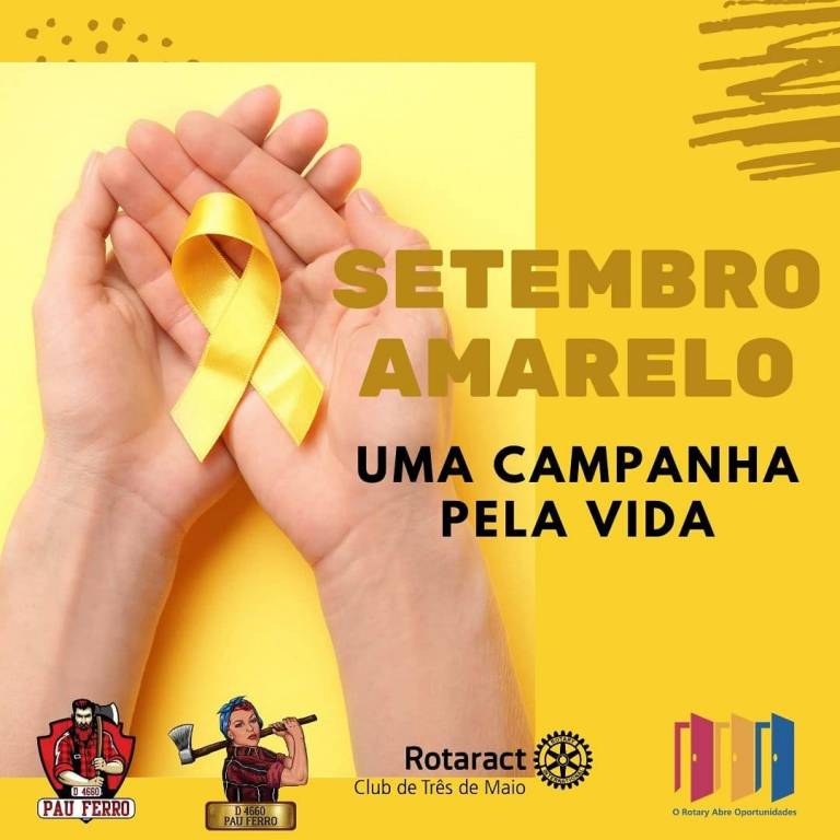 Ao longo do mês de setembro o Rotaract Club Três de Maio desenvolveu postagens nas mídias sociais para falar sobre o suicídio, divulgando os canais de atendimento do Centro de Valorização à Vida. Neste mês, ressaltamos a importância de cuidarmos da saúde mental e também identificar quando pessoas próximas precisam de ajuda.