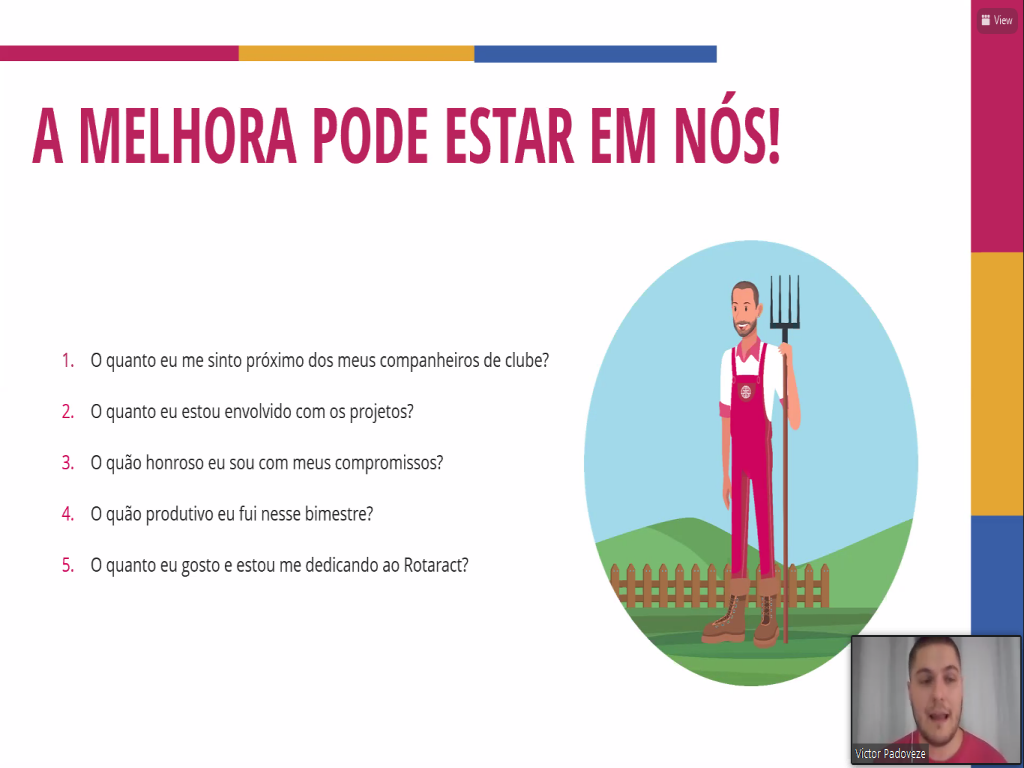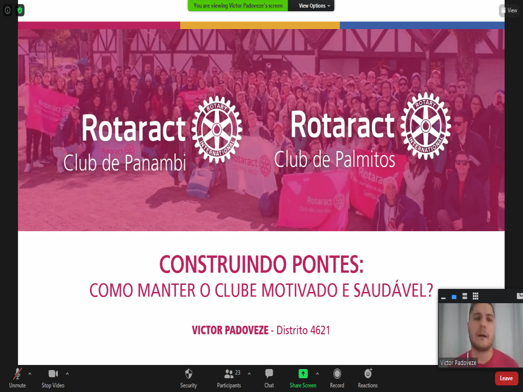 Inicialmente, o companheiro Victor Enrik Padoveze do Rotaract Club Rio das Pedras, palestrou acerca do tema “Construindo pontes: como manter o clube motivado e saudável?”. Em seguida, cada clube apresentou seus três principais projetos e o corpo associativo.