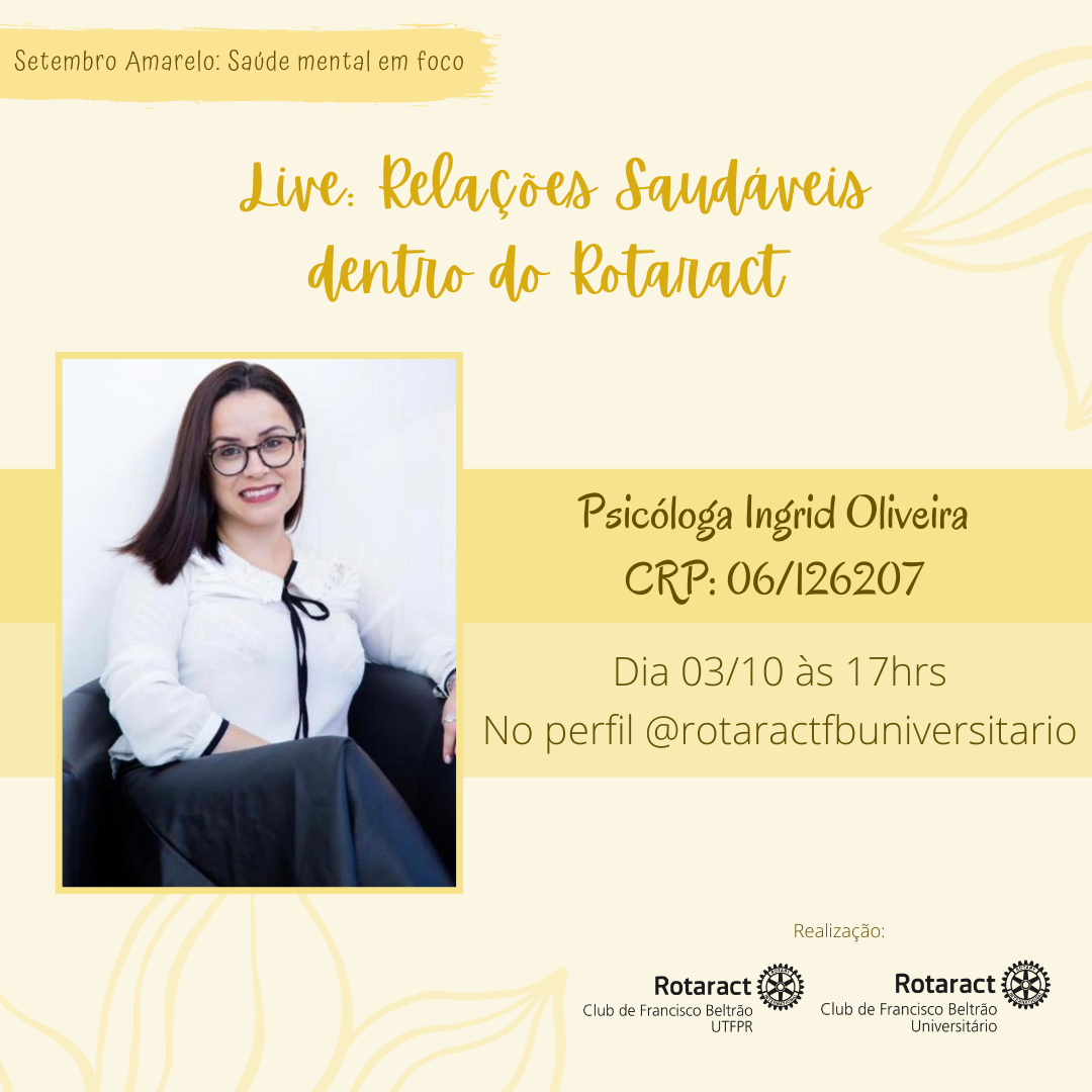No próximo sábado, dia 03 de outubro, às 17h será realizada a última live do projeto "Saúde Mental em Foco" em parceria com o Rotaract Club Francisco Beltrão Universitário, no perfil do instagram @rotaractfbuniversitário. O tema será: Relações Saúdaveis dentro do Rotaract e contará com a presença da Psicóloga Ingrid Oliveira, rotaractiana associada do distrito 4.563. Caso você tenha perdido as outras lives do projeto, elas estão salvas nos perfis @rotaract.utfprfb e @rotaractfbuniversitário.
