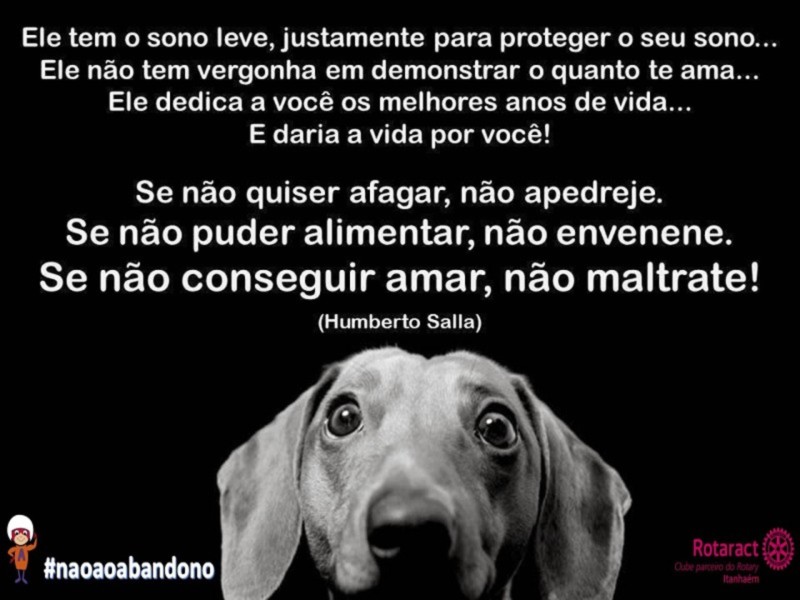 A campanha tem por objetivo a conscientização da população para que não abandonem seus animais!!! Não maltratem animais de rua!! É CRIME!!!! Os bichinhos merecem todo o nosso amor e carinho e precisam muito de nos!!! Eles não sabem pedir... Não tem ninguém que olhe por eles!!!! Vamos fazer a nossa parte!! Juntos podemos muito mais!!! #rotaractitanhaém #naoaoabandono #amorpelosanimais #campanhadeamor